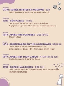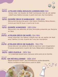 Tout est fait pour que vous passiez un moment festif avec une grande variété de jeux de sociétés autour de gourmandises sucrées, salées, et de boissons artisanales.